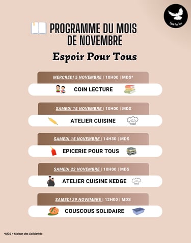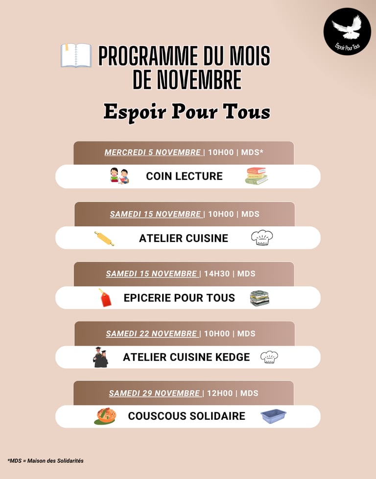 Ce mois de novembre s’annonce encore une fois riche en partages, découvertes et solidarité à la Maison des Solidarités de Talence.